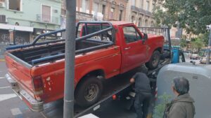 Los uniformados hicieron el secuestro y la remisión del vehículo que se hallaba con cajones sobre la Rivadavia (camioneta marca Ford modelo F-100) por constatarse la falta de verificación técnica obligatoria para circular en CABA y por no exhibir documentación cédula de autorizado ( no conduce titular), infringiendo Dec. 451-tránsito, trasladando la unidad a la playa policial.