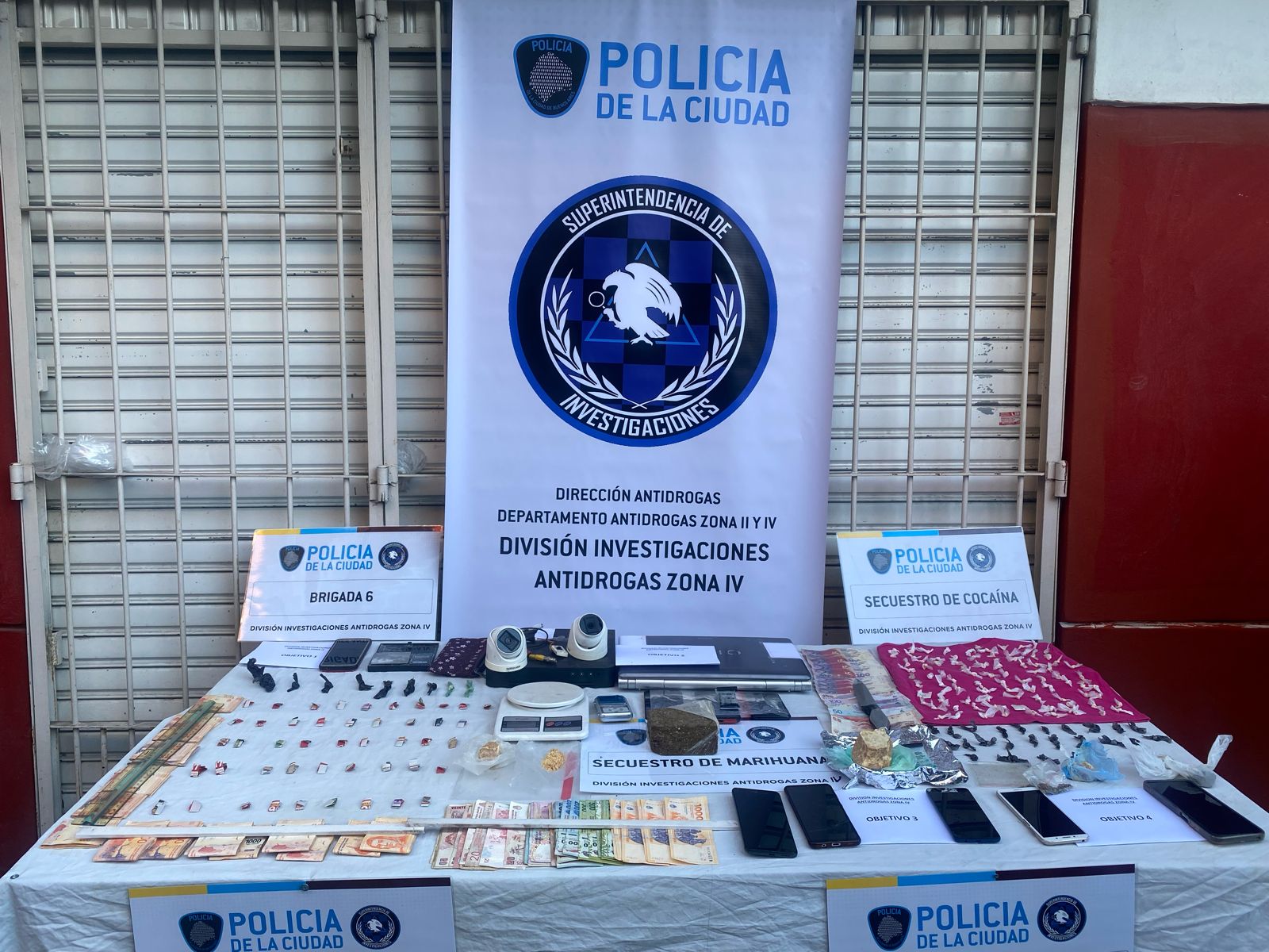 En los procedimientos, los oficiales incautaron 140 envoltorios de pasta base (158,8 gramos), 36 dosis de cocaína (10,5 gramos) y 268,4 gramos de marihuana, además de ocho teléfonos celulares y 236.140 pesos en efectivo.