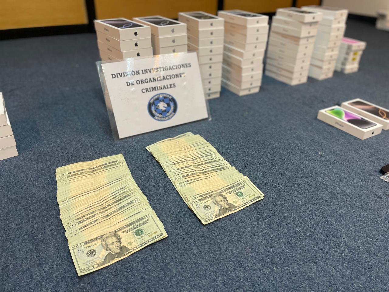 Durante los allanamientos simultáneos, se logró la identificación de los imputados y el secuestro de 15.885 dólares, 47.000 pesos, un iPad en caja cerrada, una notebook, 56 cables USB, 40 cabezales cargadores, 30 fundas con inscripción Apple, una máquina de contar billetes, una carpeta con anotaciones vinculadas a la empresa investigada, y 126 teléfonos iPhone de diferentes modelos.
