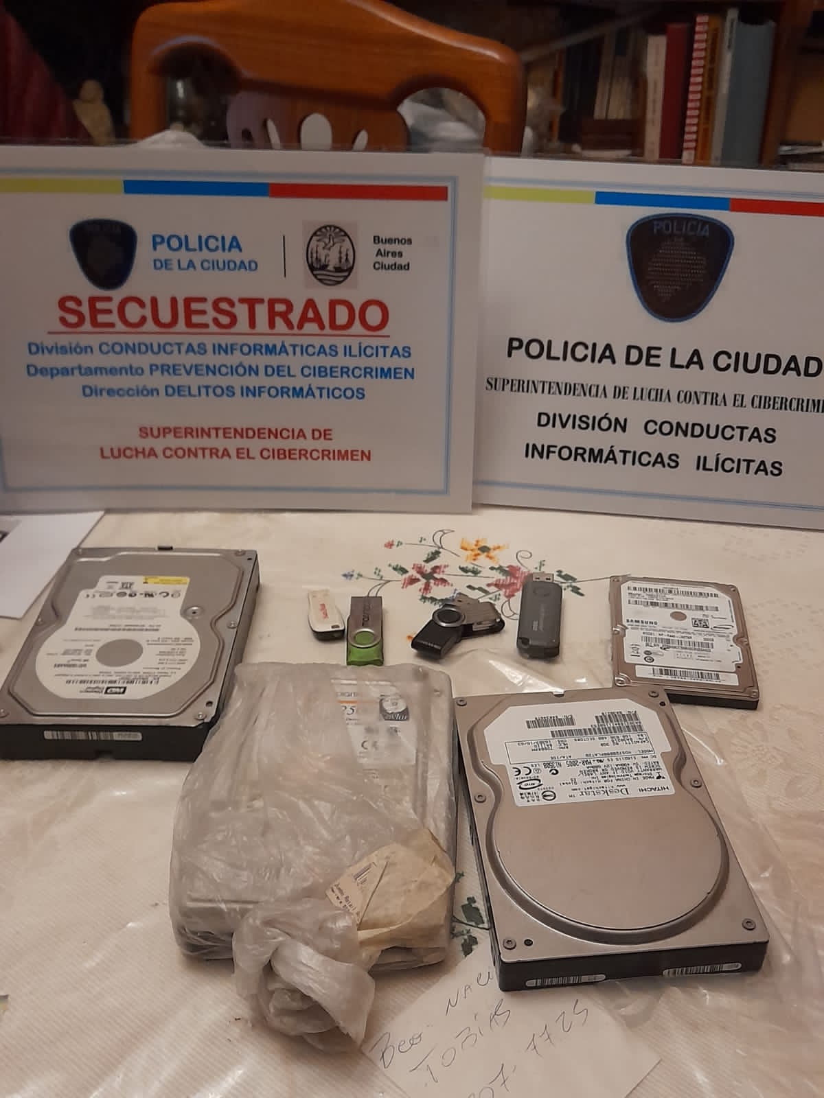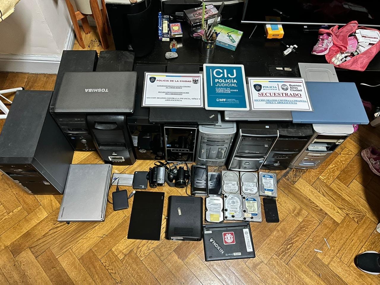 En estos operativos, los oficiales de la fuerza porteña notificaron a cinco personas e incautaron 19 gabinetes de computadoras, trece teléfonos celulares, once notebooks, dos tablets, cuatro pendrives, 19 discos rígidos, un módem, cuatro discos externos, una memoria micro SD, dos cámaras de fotos, dos filmadoras, 114 DVD, cinco tarjetas de memoria SD, tres estuches con discos compactos y 16 videos.
