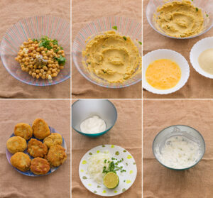 Una vez consigamos la pasta del falafel, hacemos unas bolas y las aplastamos ligeramente con las palmas de las manos, a continuación se rebozan y se fríen, acompañaremos los falafel con salsa de yogur.