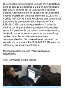 Desde nuestra organización vecinal tratamos de colaborar y apoyar en la tarea a los efectivos de la fuerza porteña.