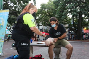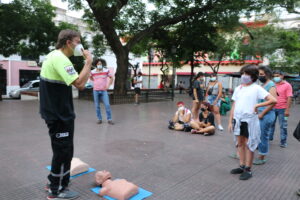 Las charlas y prácticas de RCP son brindadas por instructores de Defensa Civil, mientras que efectivos de Bomberos de la Ciudad están a cargo de actividades lúdicas e interactivas con los más chicos, dando consejos de prevención y actuación frente a situaciones de emergencia.
